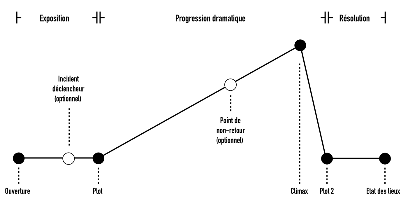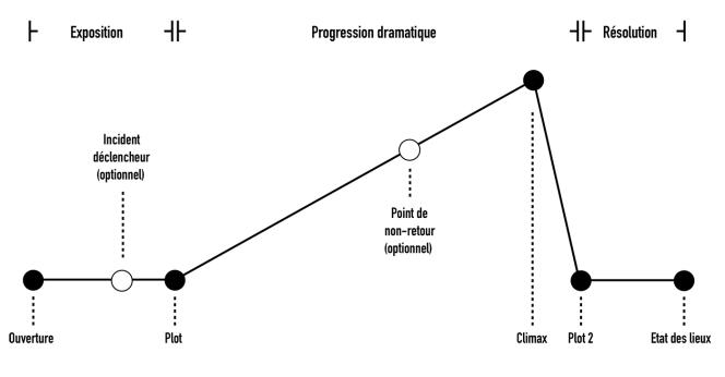 A ces moments on peut en ajouter deux, non systématiques : l’incident déclencheur, lors de l’exposition, et le point de non-retour, lors de la progression dramatique.